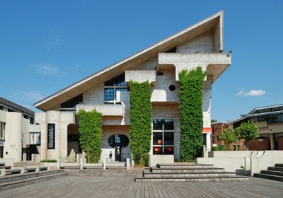 De Bibliothèque des Sciences toont ruwe betongevels, kenmerkende balkons en een opvallend hellend dak dat het profiel bepaalt.