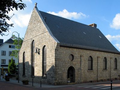 De stenen kapel staat nabij het centrum van Sankt Vith, met religieuze architectuur inclusief klokkentoren en spitse ramen.