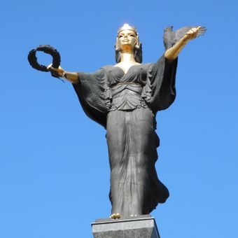 Het standbeeld combineert kenmerken van heilige Sofia en de godin Athena, waarbij wijsheid wordt vertegenwoordigd door oude en moderne kunstsymbolen. De uil op het voetstuk herinnert aan de klassieke verbinding tussen kennis en bescherming.
