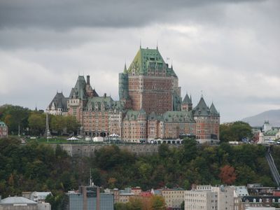 Château Frontenac is een groots spoorweghotel in Oud-Quebec, Canada, gelegen op een steile helling boven de Sint-Lawrencerivier. De gevel toont donkergrijze stenen muren onder een turkoois koperen dak met talrijke torens, schoorstenen en dakramen die het hele gebouw het aanzien geven van een Frans kasteel.