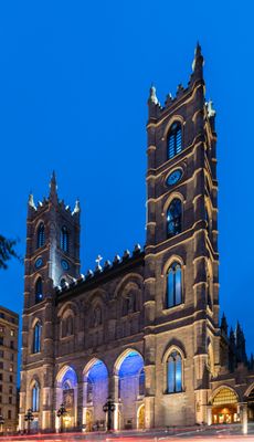 De kalkstenen basiliek voltooid in 1829 rijst op met twee torens die 60 meter boven het oude Montreal uitsteken. De westelijke toren Perseverance herbergt een grote klok terwijl de oostelijke toren Temperance tien klokken bevat. Het driebeukige interieur toont diepblauwe gewelven met gouden sterren. Het schip biedt plaats aan enkele duizenden gelovigen onder houten ribben en vergulde ornamenten.