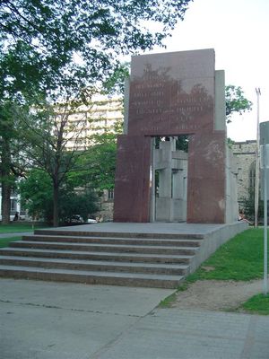 Het graniet en betonnen monument verheft zich 30 voet hoog op de kruising van Lisgar en Elgin straat, met teksten in Engels en Frans.