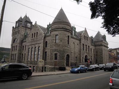 Het gerechtsgebouw van St. John's is een neoromaans bouwwerk van graniet en zandsteen, met een klokkentoren en boogvormige ingangen.