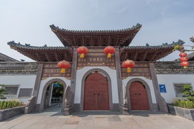 Deze tempel vertoont traditionele Chinese architectuurelementen met gebogen daken, houtsnijwerk en ceremoniële zalen in symmetrische opstelling.