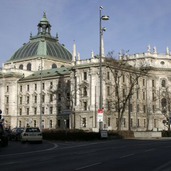 Justizpalast is een gerechtshof in München met een glazen koepel van 67 meter in het midden en granieten gevels die twee binnenpleinen omgeven. Het gebouw toont rechtsymbolieken door zijn architectonisch ontwerp en gesneden decoratieve elementen in zijn openbare ruimten.