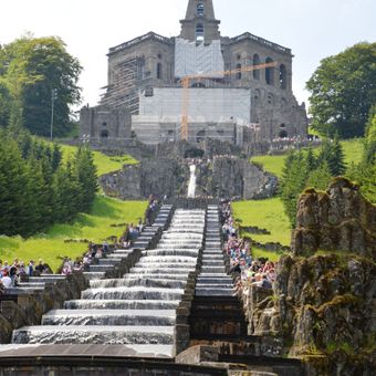 Het Herculesmonument in Kassel is een markante constructie in het Bergpark Wilhelmshöhe met een koperen beeld geplaatst op een achthoekige fundering en een piramidestructuur eronder. Het gehele complex is opgebouwd uit meerdere niveaus die met elkaar verbonden zijn door trappen en platforms.