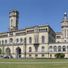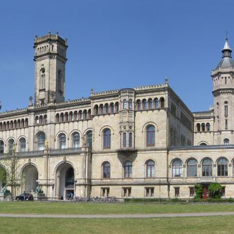 Het Welfenschloss is een zandstenen paleis in Hannover dat dienst doet als hoofdgebouw van de Leibniz-universiteit. De structuur toont afgeronde boogkenmerken en is gebouwd met geel-witte zandsteenuit lokale groeves.