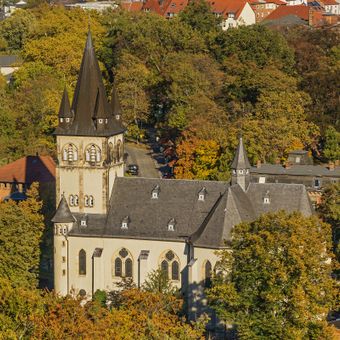 De Herz-Jesu-Kirche vertoont een architectonische structuur met een veelhoekig koor, verschillende zijkoren en een achthoekige daktorentje.