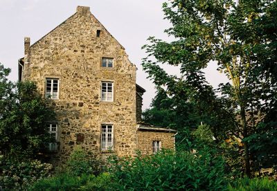 De zuidwestelijke gevel van het kasteelhuis toont een ridderreliëf dat in 1938 opnieuw werd geïnstalleerd volgens lokale historische documentatie.