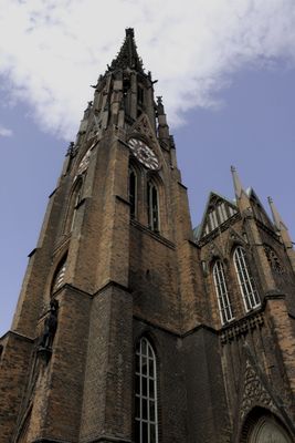 De driebeukige kerk heeft spitsbogen aan de zijgevels en decoratieve geglazuurde klinkers over de gehele buitenstructuur.