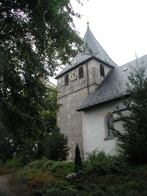 De Sint-Vituskerk vertoont een traditionele Duitse kerkelijke architectuur met een klokkentoren die boven de centrale structuur uitsteekt.