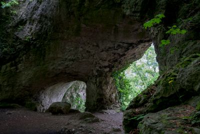 Een natuurlijke boog met twee gewelven staat voor de grotteingang, wat een karakteristieke geologische formatie creëert die deze locatie van andere grotten onderscheidt. Deze stenen boog werd gevormd door erosie gedurende miljoenen jaren en creëert op ongewone wijze een frame rond de grotteingang.