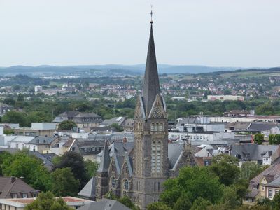 De Johanneskirche is een kerkgebouw in het centrum van Giessen met donkere stenen muren en heldere zandsteenstroken. De hoge kerktoren is een van de meest onderscheidende architecturale kenmerken van de stadshorizon.
