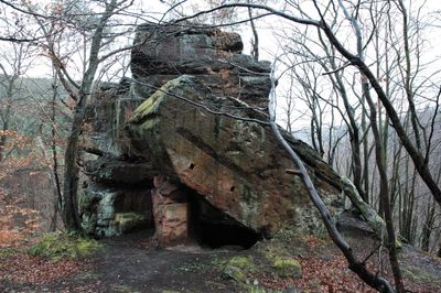 Nonnenfels is een rotskasteel in de Palts dat zich hoog boven de Isenachvallei verheft met stenen versterkingen direct geïntegreerd in natuurlijke rotsformaties. De constructie onderscheidt zich in het landschap en creëert een opvallende silhouet tegen het omliggende terrein.