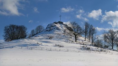 De Wachtküppel berg bereikt een hoogte van 705 meter en staat in het Rhöngebergte, met uitzicht over het omliggende natuurlandschap.