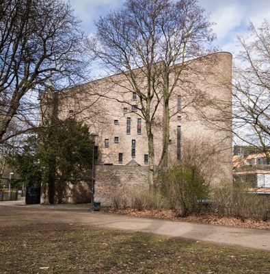 Nadat de oorspronkelijke Sint-Albanuskerk in 1945 werd verwoest, ontwierp architect Hans Schilling dit moderne gebouw dat in 1959 werd voltooid.