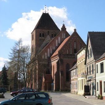 St. Marien staat als een driebeukige en drievoudige hallenkerk gebouwd van rode bakstenen met een massieve toren.