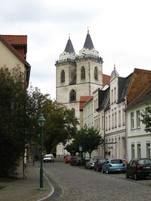 De torens waren oorspronkelijk gepland om hoger te zijn dan de Dom van Magdeburg, maar aartsbisschoppelijke beperkingen reduceerden ze tot de helft.