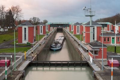 De sluis gebruikt gespecialiseerde waterbesparende technieken die waterverlies minimaliseren tijdens scheepspassages tussen verschillende niveaus.