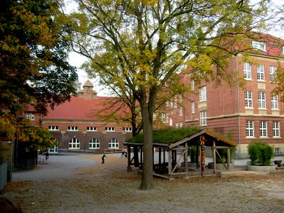 Het schoolgebouw van de Ernst-Henning-Strasse toont traditionele architectuurelementen uit 1910, ontworpen door architect Rischpler met versierde gevels en grote ramen.
