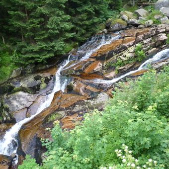 Steinerne Renne is een kloof met waterval en granieten rotsblokken die zich honderden meters door het landschap uitstrekt. Water stroomt door nauwe passages tussen steile rotsenwanden en vormt een indrukwekkende natuurlijke structuur.