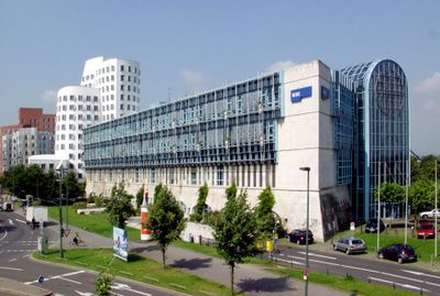 Het WDR Studio Dusseldorf is een radiofaciliteit in Medienhafen met een gebogen glazen ingangshal en een gevel die natuursteenplaten combineert met glaselementen omrand door muntgroene strips. Productiestudio's bevinden zich in de kelder, terwijl de bovenste verdiepingen kantoorruimtes bevatten die zichtbaar zijn achter transparante wanden.