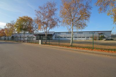 De Albert-Vahle-Halle beschikt over een witte tribune met een opvallende glazen gevel en een overstekend dak van 16 meter hoog en 18 meter breed.