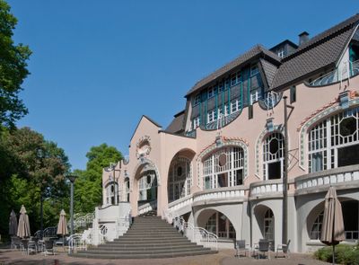 Wolfsburg is een educatief centrum in Mülheim an der Ruhr dat in het vroege 1900 is gebouwd met Art Nouveau-elementen. De westelijke gevel vertoont grote ramen en sierlijke steendetails die het ambachtelijke vakmanschap van die periode weerspiegelen.