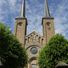Sint-Servaas toont een dubbele torengevel van 65 meter hoog met rondboogvensters en decoratieve reliëfs op de stenen buitenkant.