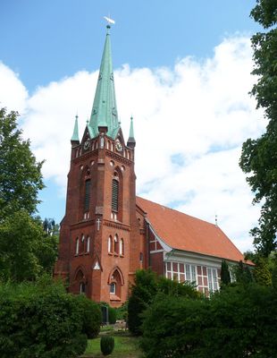 De St. Nikolai kerk heeft een hoge torenspits, decoratieve stenen elementen en grote ramen die het hoofdschip verlichten.