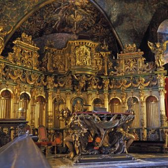 De kapel, voor het eerst gedocumenteerd in 1396, behield haar locatie tijdens meerdere renovaties en kreeg haar maniëristische decoratie in de vroege 17e eeuw.