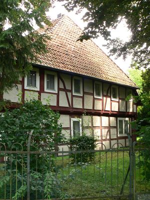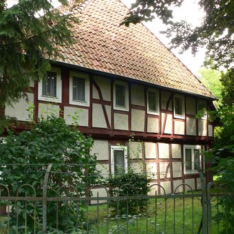 Het voormalige landgoed toont traditionele Duitse vakwerkarchitectuur met zichtbare houten constructies aan de buitenmuren van beide gebouwen.