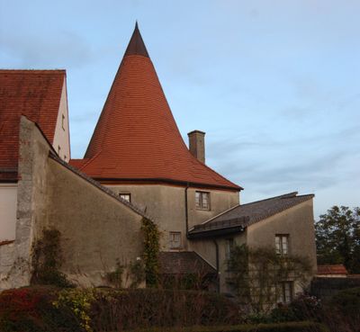 Ehemaliger Wehrturm, sogenannter „Kornmesserturm“, dreigeschossiger Rundturm mit kegelförmiger Turmspitze und zwei angebauten zweigeschossigen Pultdachbauten, spätmittelalterlich