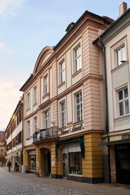 Johann-Sebastian-Bach-Platz 7, dreigeschossiges Gebäude mit Walmdach, mit rückwärtig anschließenden Gebäuden und Treppenturm, Fachwerkbau, 1550–1800, Fassade mit rustizierten Lisenen und Geschossgliederung von Karl Friedrich von Zocha, 18. Jahrhundert