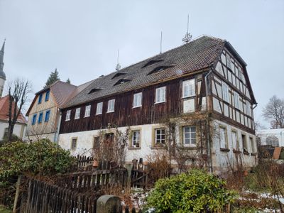 Pfarrhaus und Scheune des Pfarrhofs, davor Granittrog und Granitfreitreppe, zwei Blitzableiter Geißlerweg 1, woonhuis in Sohland an der Spree, Duitsland