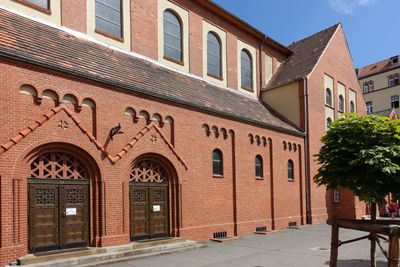 Saint Clement Church is een katholiek kerkgebouw in Kreuzberg met traditionele architectuur van stenen muren, boogvensters en een prominente klokkentoren in het centrum. De structuur vertoont klassieke kerkontwerpelementen met zorgvuldig uitgevoerde details op de hele buitenkant.