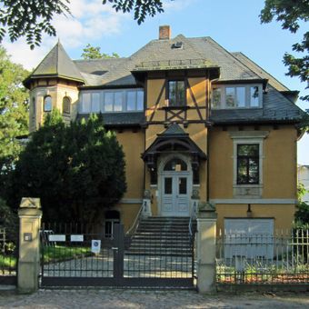 De villa van twee verdiepingen aan de Tauscherstraße 44, gebouwd in zandsteen en baksteen, heeft meerdere balkons, versierde raamkozijnen en vakwerkelementen.