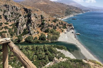 Preveli Beach is een kustgebied in zuidelijk Kreta waar een rivier door dichte palmvegetatie stroomt en heldere bassins vormt voordat deze de Libysche Zee bereikt. De smalle zandstrand wordt omlijst door steile rotsen, met begroeiing die bijna tot aan het water reikt.