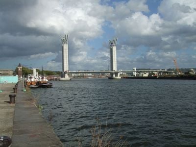 De Pont Gustave-Flaubert is een hefbrug in Rouen die 670 meter overspant over de Seine en rust op vier massieve betonnen torens. Deze pylonen rijzen 86 meter boven het wateroppervlak uit en dragen de twee beweegbare rijdekken.