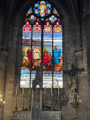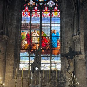 Een opmerkelijk glas-in-loodraam, gemaakt door meester-emailleur Leonard Pénicaud in de zestiende eeuw, bevindt zich boven het hoofdaltaar en beeldt de Kroning van Maria uit.