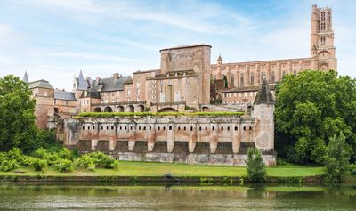 De Bisschopsstad Albi toont architectuur van rode baksteen in haar structuren, waaronder de Sint-Ceciliakathedraal en het voormalige Bisschoppelijk Paleis langs de rivier de Tarn.