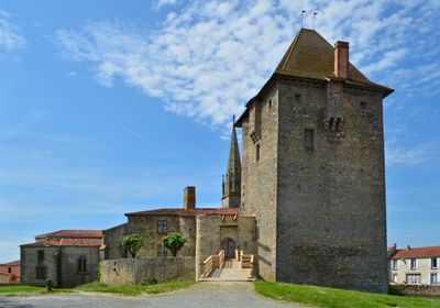 Het Château d'Ardelay toont een 15e-eeuwse verdedigingsarchitectuur met een vierkante donjon en machicoulis die uitkijken over de binnenplaats.