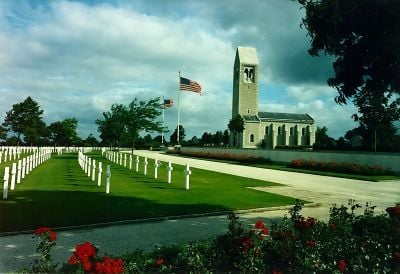 De Amerikaanse begraafplaats van Bretagne bevat 4.410 witte marmeren grafstenen, gerangschikt in 16 waaiervormige percelen over 28 acres.