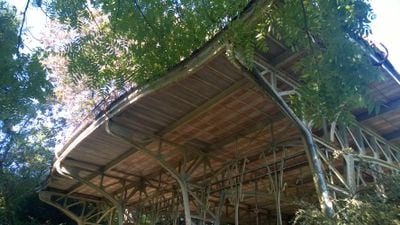 De staalconstructie heeft vier vakwerken op consoles verbonden door acht I-balken, rustend op metselwerk fundamenten met keukens.