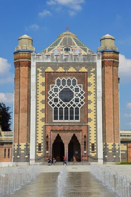 De kerk toont hoge gewelfde plafonds, complexe decoratieve elementen en een 51 meter hoge toren gemaakt van veelkleurige zandstenen.