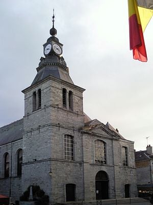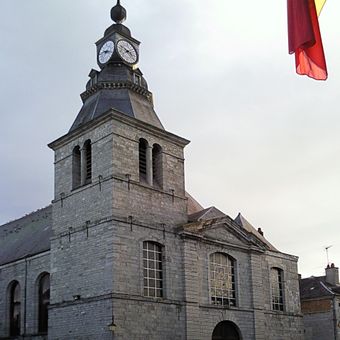 De Sint-Hilariuskerk staat in het centrum van Givet, gebouwd uit blauwe steen met een opvallende leien klokkentoren op de noordwesthoek.