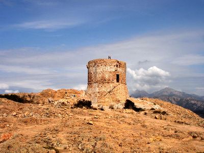 De stenen toren staat op 331 meter hoogte op de kaap Capu Rossu, met uitzicht over de Middellandse Zee en de Corsicaanse kust.