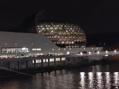 De beweegbare zonne-installatie in de vorm van een zeil draait overdag en wekt elektriciteit op voor het hele complex. De halfcirkelvormige constructie geeft het gebouw een herkenbaar silhouet boven de Seine.