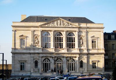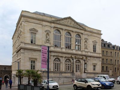 De driehoekige fronton toont een allegorie van Louis-Victor Bougron die de Wet voorstelt, omringd door Kracht en Gerechtigheid die Kunsten, Wetenschappen, Handel en Industrie beschermen.