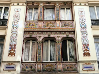 De geëmailleerde lavadecoraties op de gevel waren oorspronkelijk bedoeld voor de Saint-Vincent-de-Paul kerk maar werden hergebruikt na religieuze bezwaren.